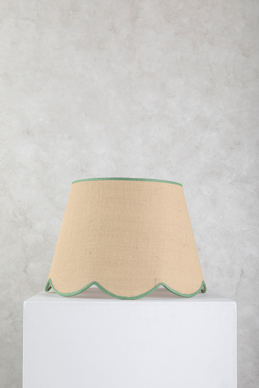 This is our large size Soffle shade, which measures 25cm wide across the top, 35cm wide at the base, and is 24cm high. The piece is handcrafted from highest quality natural jute, and is finished with our Soffle signature scalloped edge.